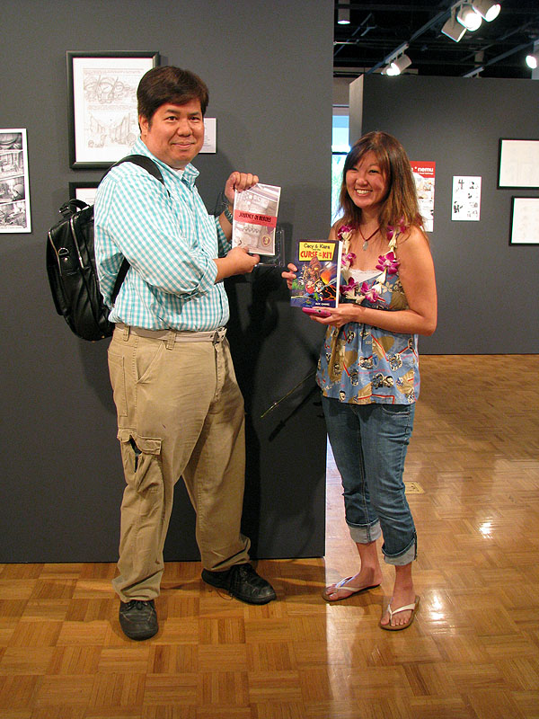 You can also get a virtual taste of the exhibit at the excellent tie-in website hawaiimanga.com, with exhibit photos, sound clips of the featured artists and downloads for a treasure trove of materials including the exhibit booklet, Rose Dela Cruz’s tie-in manga and bookmarks with Audra Furuichi’s nemu*nemu pups. Brady, along with featured artists Tara Tamayori and Audra, also did an interview with Hawaii Public Radio’s Noe Tanigawa posted under the somewhat unfortunate title of “POW! Crossing Cultures: The Art of Manga in Hawaii.” (I’m sorry, but the whole “let’s add sound effects to something about comics, because when people think comics, they think of the Adam West-era Batman TV show” strikes me as a tired media cliche, ranking right up there with “MANGA! Wow! Girls are reading comics now!” on the irritation scale for me.)