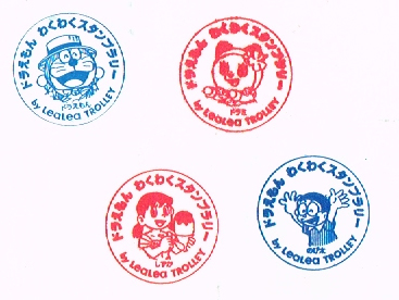 It turned out that this statue, along with the Ward statue, were both part of the aforementioned “Doraemon Wakuwaku Stamp Rally,” a promotion hosted by HIS Hawaii’s Lea Lea Trolley. As I understand it — sadly, I haven’t been able to get anyone from HIS to formally comment on what’s going on — Japanese visitors who sign up for a certain tour package get a stamp card and go around town collecting seven stamps at various locations. (That’s one of the stamp pads on the table.) Here’s what some of those stamps look like.
