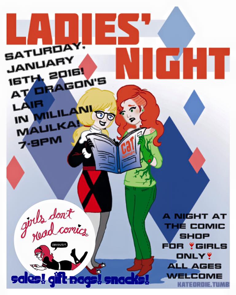 Out in Mililani Mauka, Dragon’s Lair — the best little comic and collectibles store in Central Oahu, according to me and cartoonist Jon Murakami’s Instagram feed (seriously! all those pictures of cool things he posts! *grabby hands*) — will be hosting its second Ladies Night from 7 to 9 p.m. Saturday. Ladies, expect a night full of special discounts, snacks, gift bags and just a good time of hanging out with fellow geeky gals like yourself. Guys, Starbucks, McDonald’s, Wing Stop and Taps & Apps are all available for your gathering purposes. Dragon’s Lair is at 95-1840 Meheula Parkway, space E-10; call 597-6981 or visit facebook.com/dragonslaircomics.