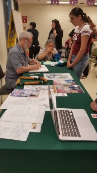 Previous Image Next Image Stan Sakai at McCully-Moiliili Library Those are a bunch of original scripts and sketches in the foreground, too. (Photo by Jason S. Yadao.)